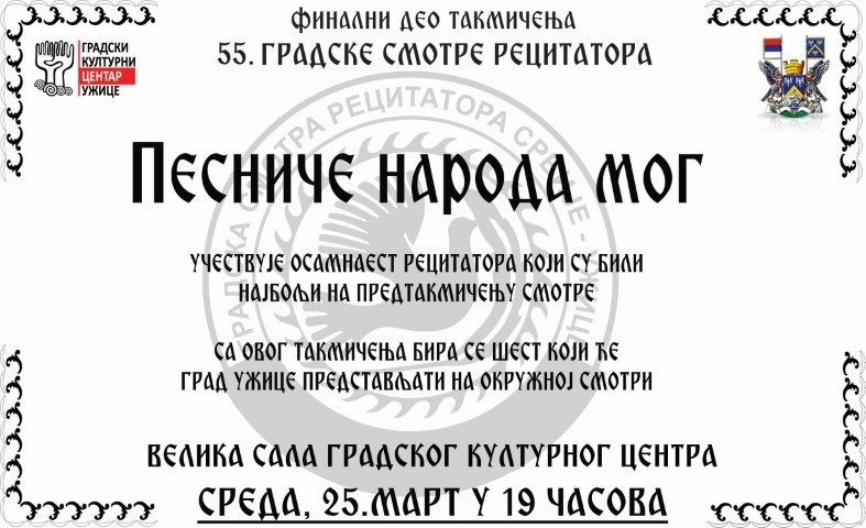 55. градска Смотра рецитатора ''Песниче народа мог'' била је одржана у среду 25.марта у Градском културном центру.